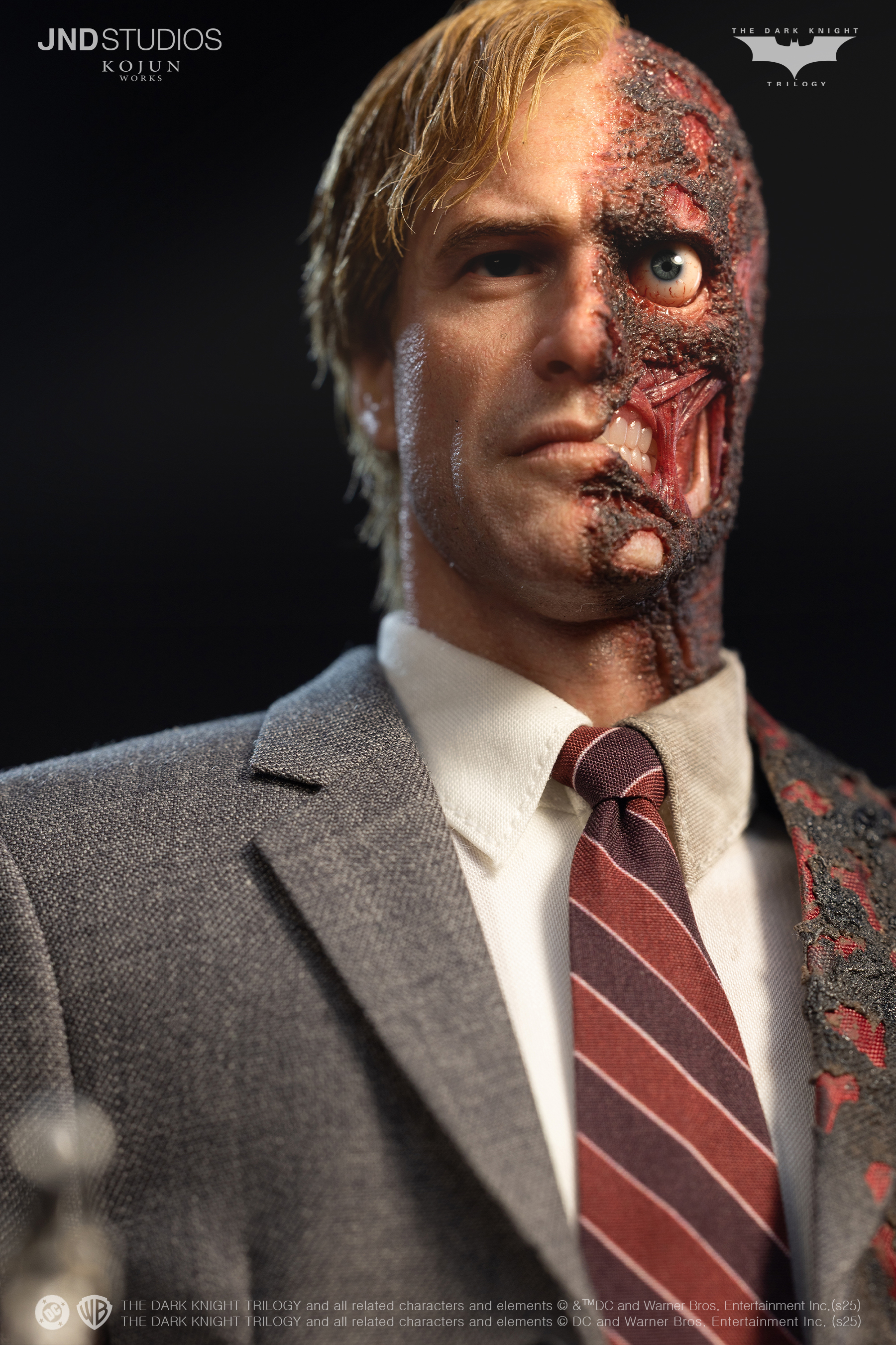 * Hyper-realistic head sculpt faithfully recreating actor Aaron Eckhart’s likeness